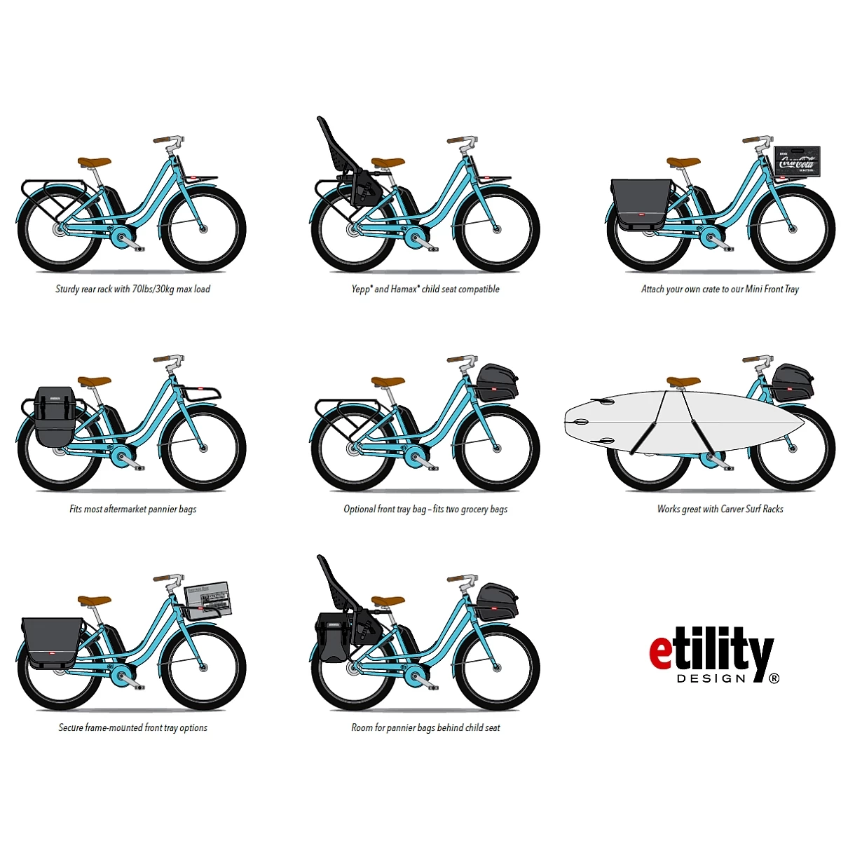 The Benno eJoy, with Etility® Design, is so much more than cute. This is a seriously smart, seriously capable bike built around the industry leading Bosch mid-drive electric motor. The sturdy rack and available front trays and storage bags let you carry 2x more weight than the typical bike.