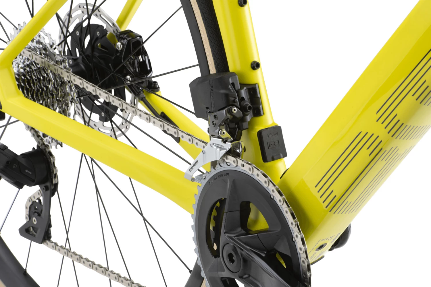 SRAM’s Rival eTap AXS 12-speed wireless groupset, plus 25mm XRD-522 wheels with 30mm tires ensure uncluttered, practical performance.