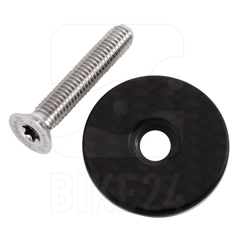 Superlight A-Headset carbon cap, CNC machined, 3K matte with white graphics, comes with a laser engraved 35mm Al7075-T6 color anodized TORX screw.