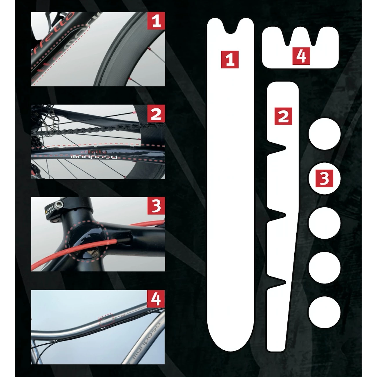 A sheet with pre-cut elements specific for off-road purposes, to easily protect sensitive frame areas (chainstays, down tube, cable/frame contact points, horizontal tube against brake levers contact).
