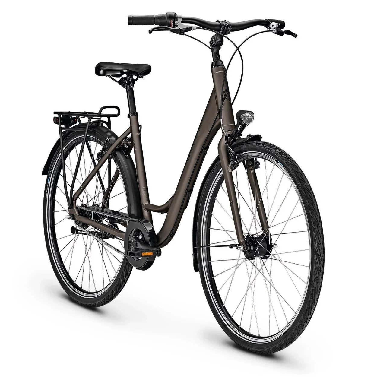 With the Shimano Nexus 7-speed hub gear you have a comprehensive gear selection, which is perfectly adequate for everyday use. The Nexus is considered particularly durable and low-maintenance circuit. Lightweight V-Brakes and the shapely rigid fork contribute to the weight reduction here. A full LED lighting system with hub dynamo, luggage rack, mudguards, side stand and a chain guard round off the overall package and make the elegant Kalkhoff convincing in road traffic.