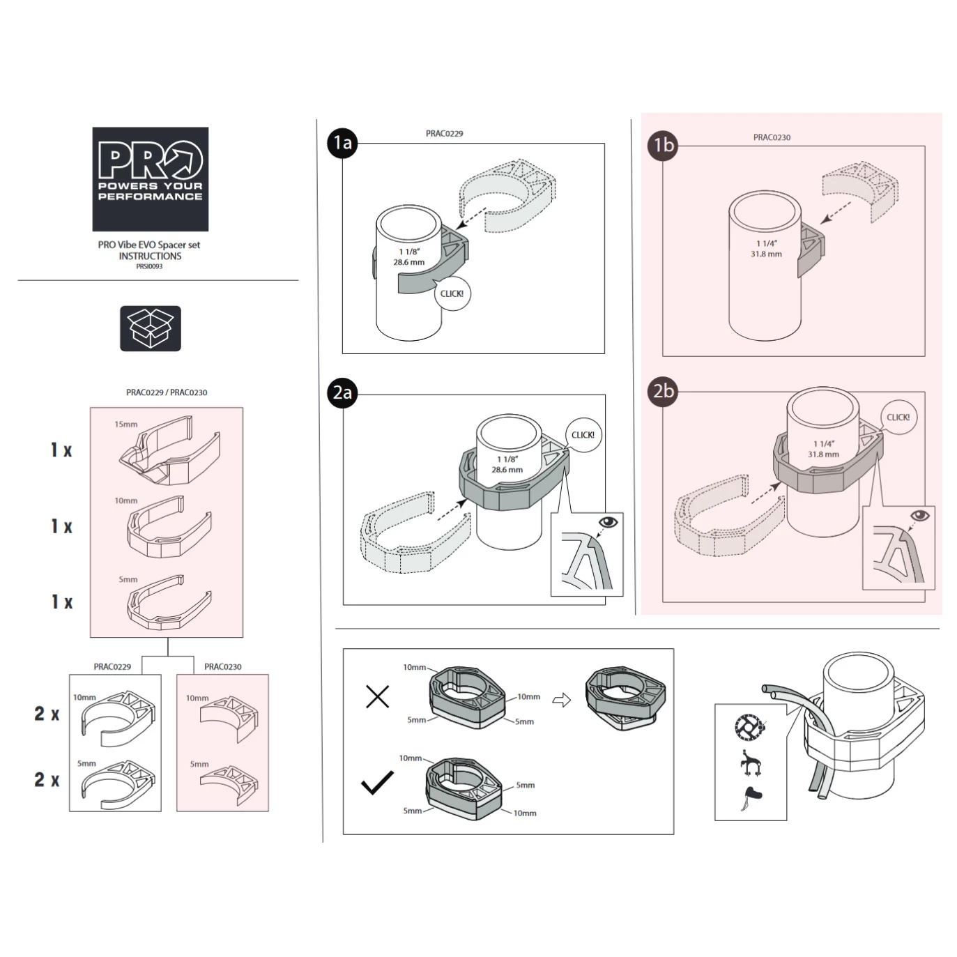 The PRO Vibe EVO spacer kit allows in conjunction with the PRO Vibe EVO handlebar a perfectly tuned position. The set includes spacers in the heights 5, 10 and 15mm and is compatible with 1 1/4″ steerer tubes, so that the height of the integrated Vibe EVO cockpit can be adjusted exactly to individual needs. The two-piece design of the spacers allows the height to be adjusted without having to re-route shift cables and brake hoses. A corresponding routing channel for internal routing is integrated.
