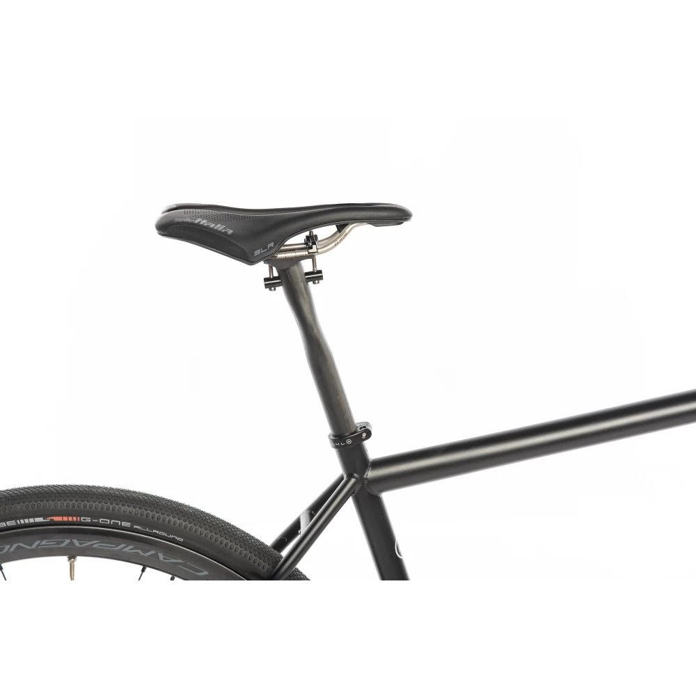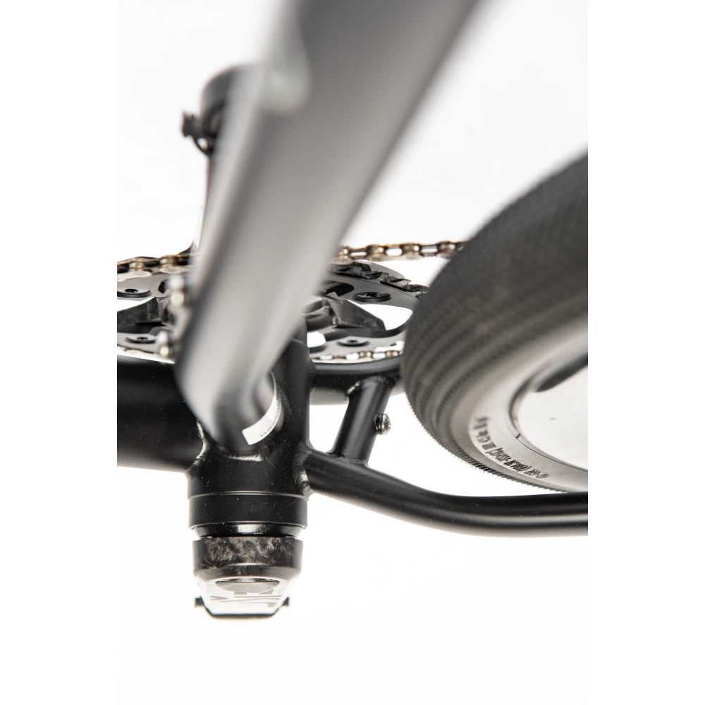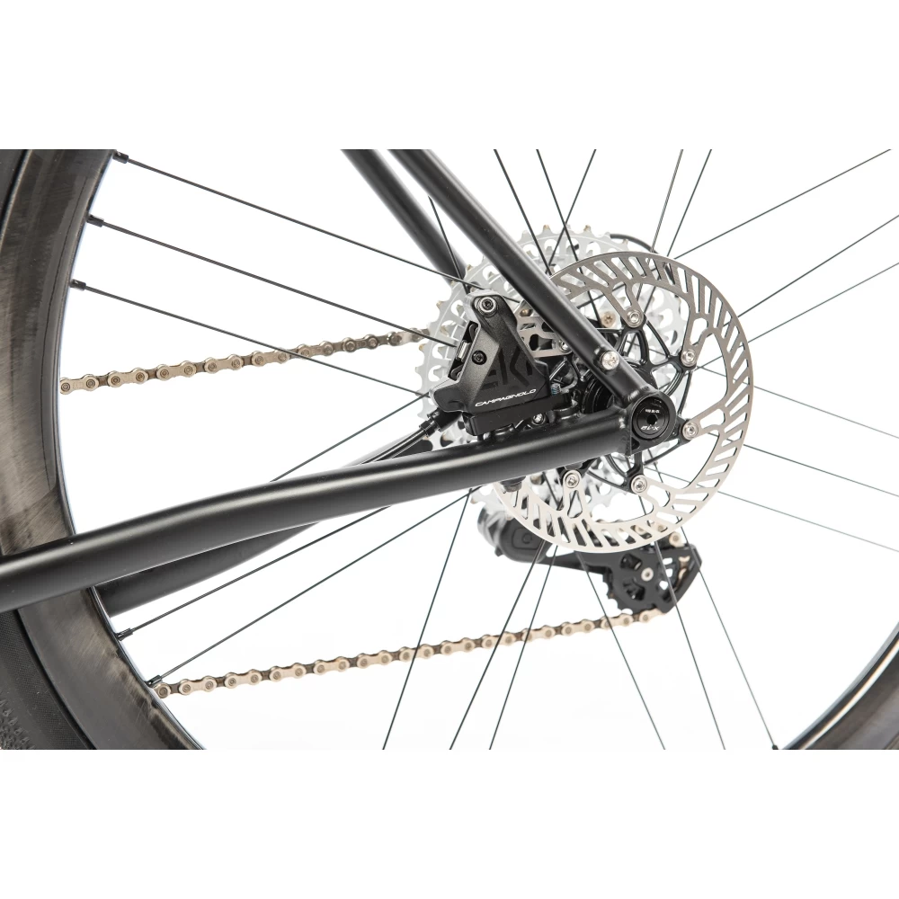 In addition, the frame can accommodate a specially designed luggage rack. A specially designed carbon seatpost with leaf spring design in the head area also gives excellent flex. In addition, the seat stay on the right side was pulled down to provide more space for the chain, especially for the modern 1x drives. With optimized tube shapes, a track-precise fork and the Campagnolo EKAR shifting group, this wheel represents in every respect a new benchmark among the Gravel bikes.