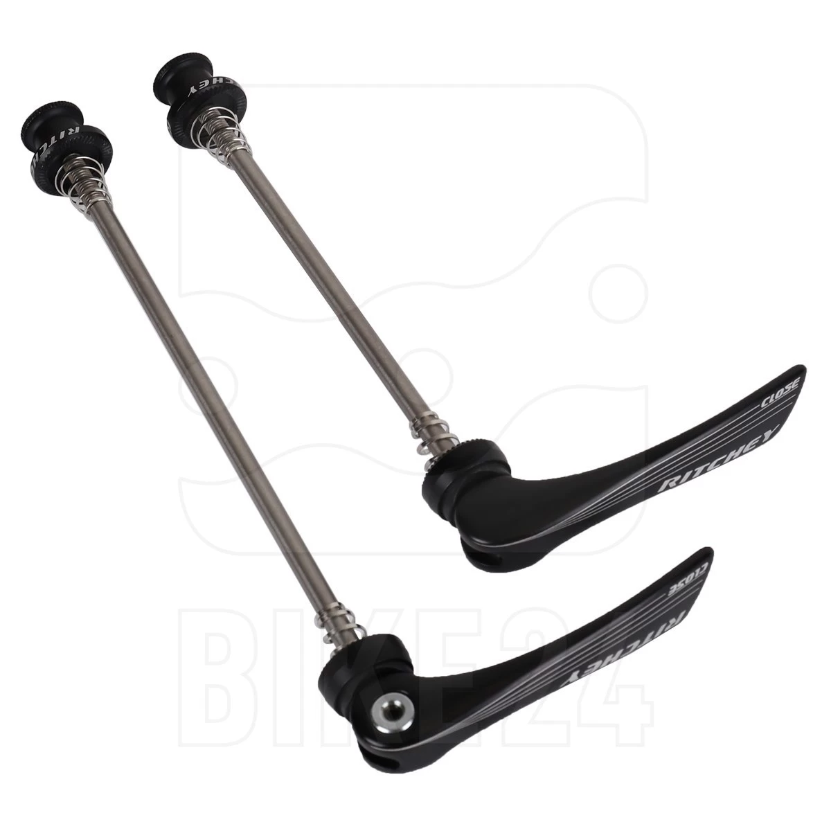 Extra lightweight Ritchey road quick release set with high clamping power. Only 83 grams per pair thanks to forged alloy levers, titanium skewers and steel springs. Front and rear specific design with asymmetric shape that optimizes chainstay clearance. Set includes front (100mmm OLD) + rear (130/135mm OLD) QR.