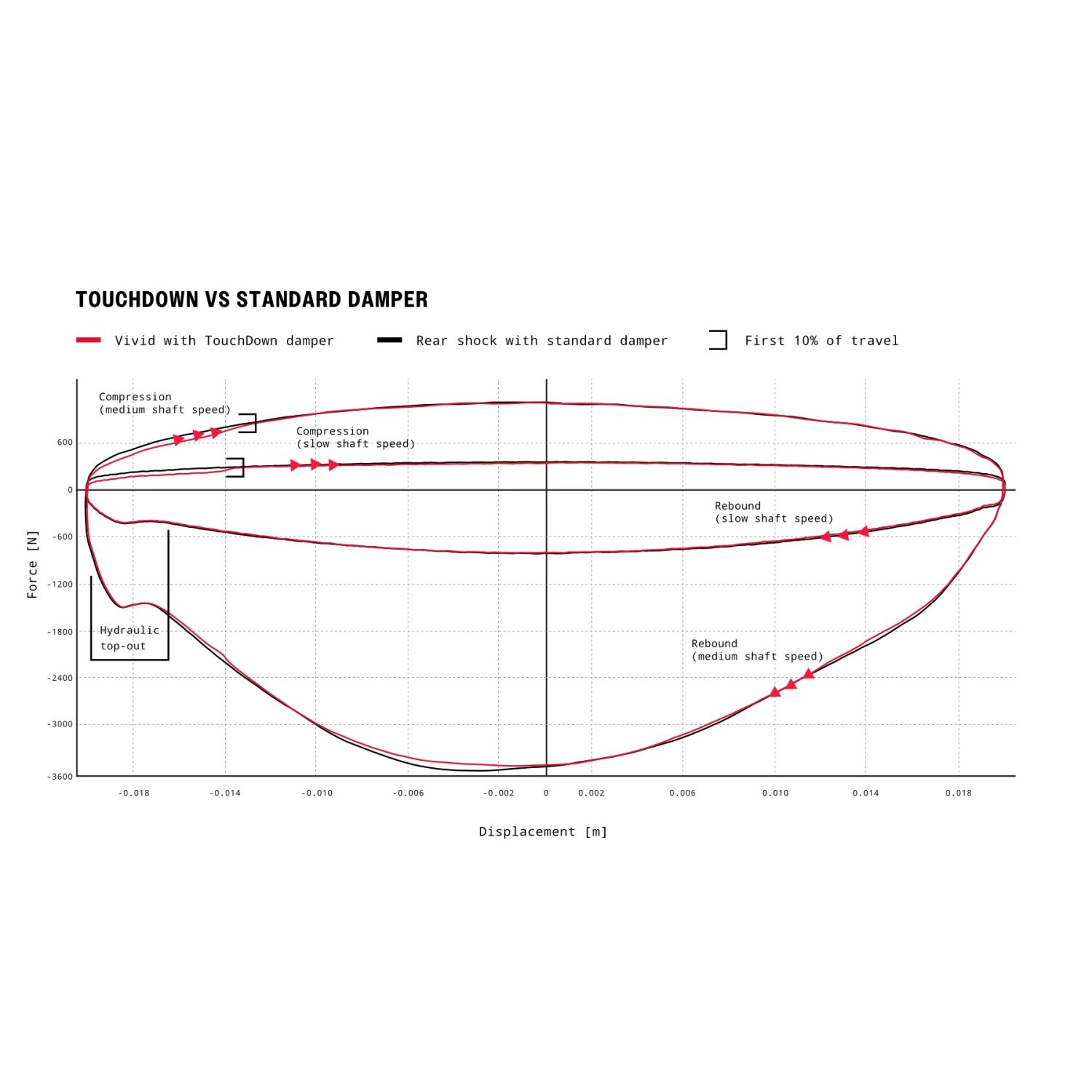 The position-dependent TouchDown damping system ensures that the rear shock responds slightly at the beginning of the travel, while remaining quiet in the middle and end of the stroke. Each stage of the suspension transitions seamlessly to the next, leaving only the exhilarating feeling at the end of the descent. With comfort, confidence and control, the TouchDown damper balances everything from a slight jerk to a long jump.