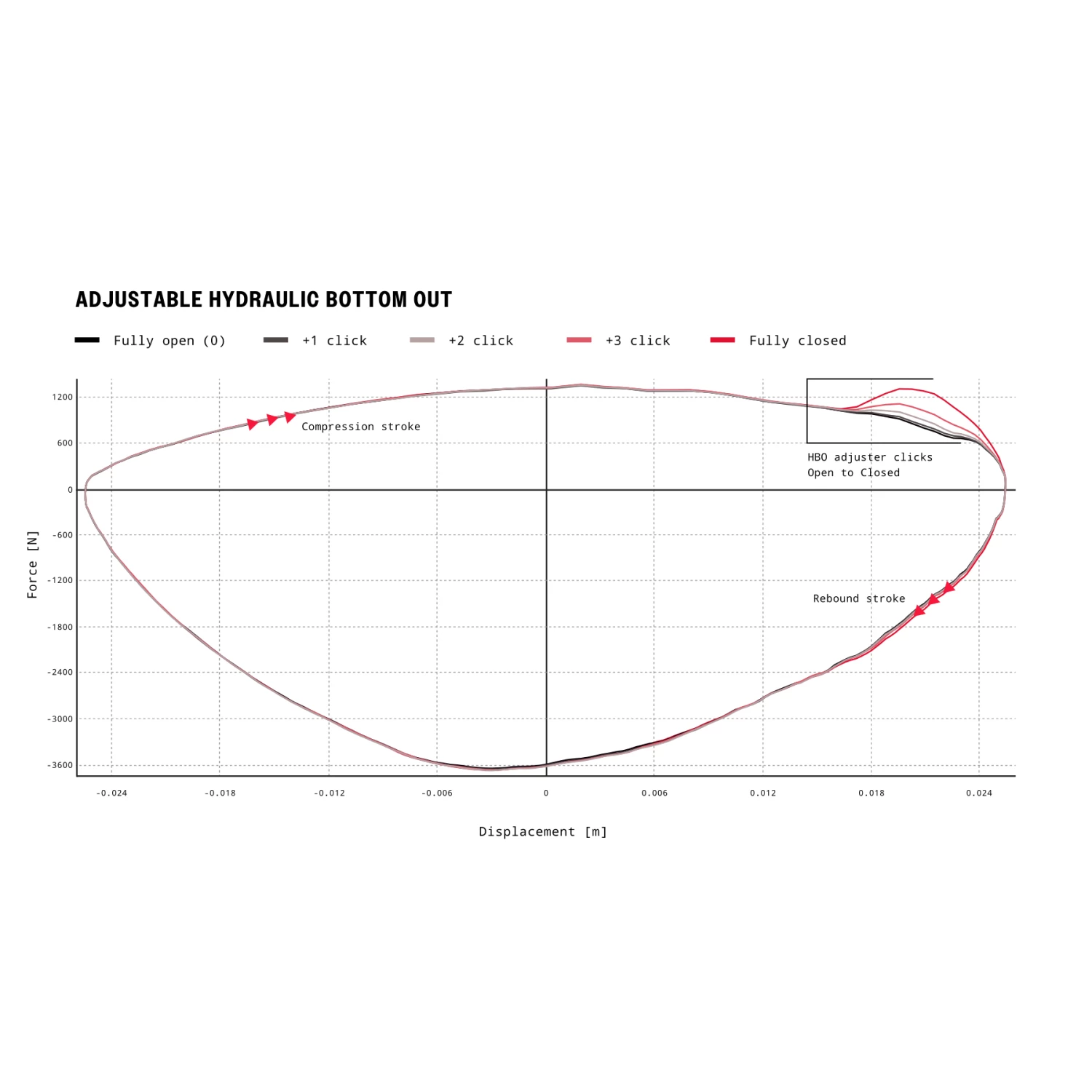 TouchDown technology bypasses main piston compression damping in the first 10 % of travel for a smooth response. Suppressing vibration, however, is just the beginning. To handle rough terrain, the next 70 % of travel is damped by controlled and stable compression damping. In addition to the adaptability of TouchDown technology, adjustable hydraulic Bottom Out (AHBO) allows the suspension to tune for the hard hits in the last 20 % of travel.