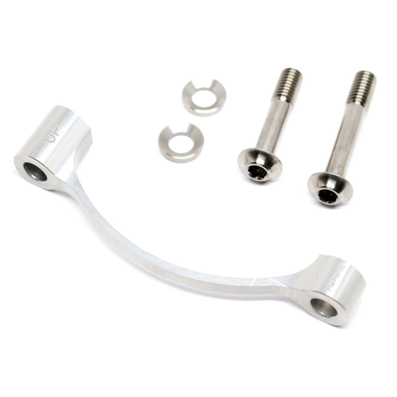 Brake adapter for postmount fork or rear triangle and for postmount brake calipers. For adaptation to 20mm larger brake discs. Set consists of 1 adaptor made of 7075 aluminium, 2 titanium screws with convex head underside and two machined, concave stainless steel washers.